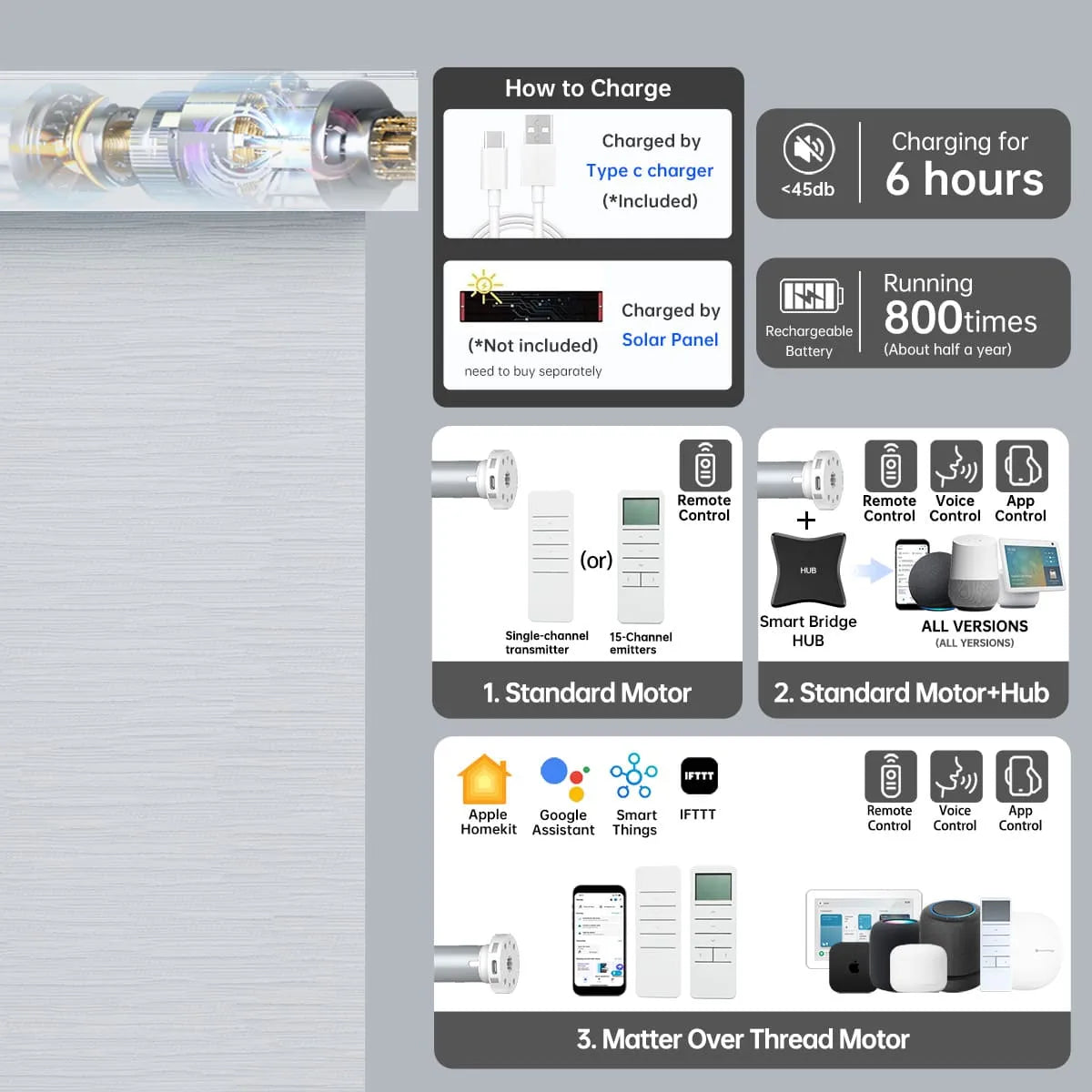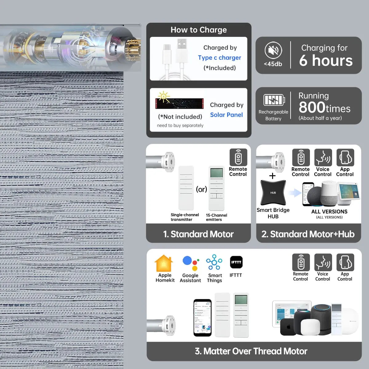 - Control Options: Motorized (Bluetooth / Zigbee / Matter)